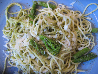 This was a using up leftover bits kind of dinner - the pesto was in the freezer from a previous meal; the broccoli and asparagus were both extra bits from previous dinners. Win-win.